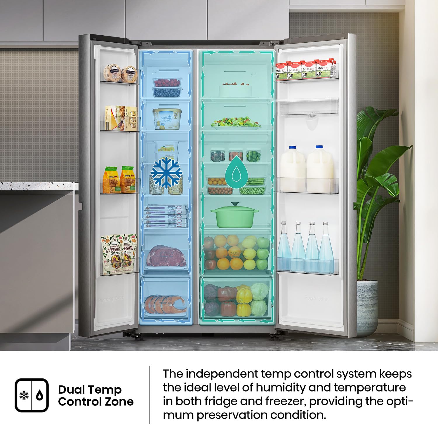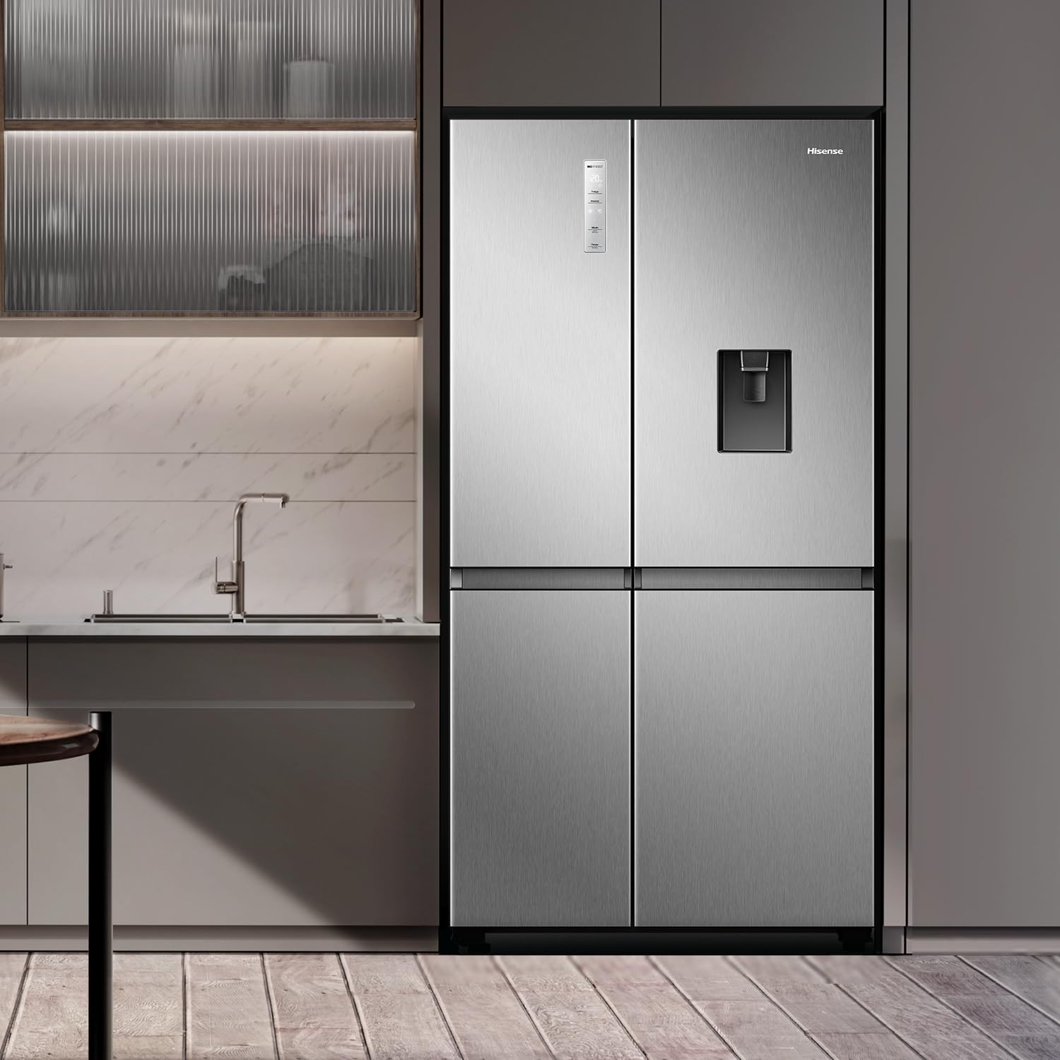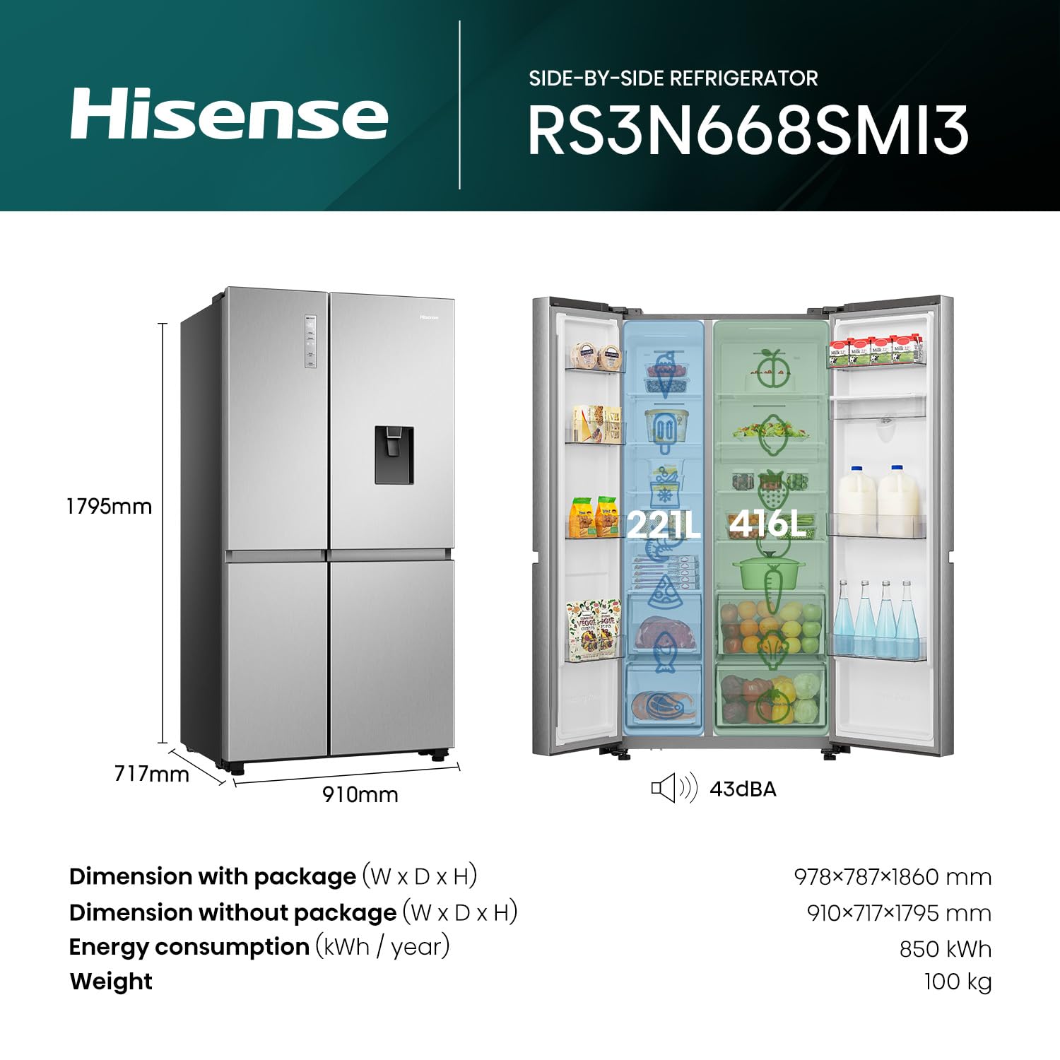Hisense RS3N668SMI3 - ثلاجة ببابين جنبًا إلى جنب 869L ثلاجة، موزع مياه بدون سباكة، منطقة تحكم مزدوجة في درجة الحرارة، عاكس متين، 91×71.7×179.5 سم (طول×عرض×ارتفاع)، فضي