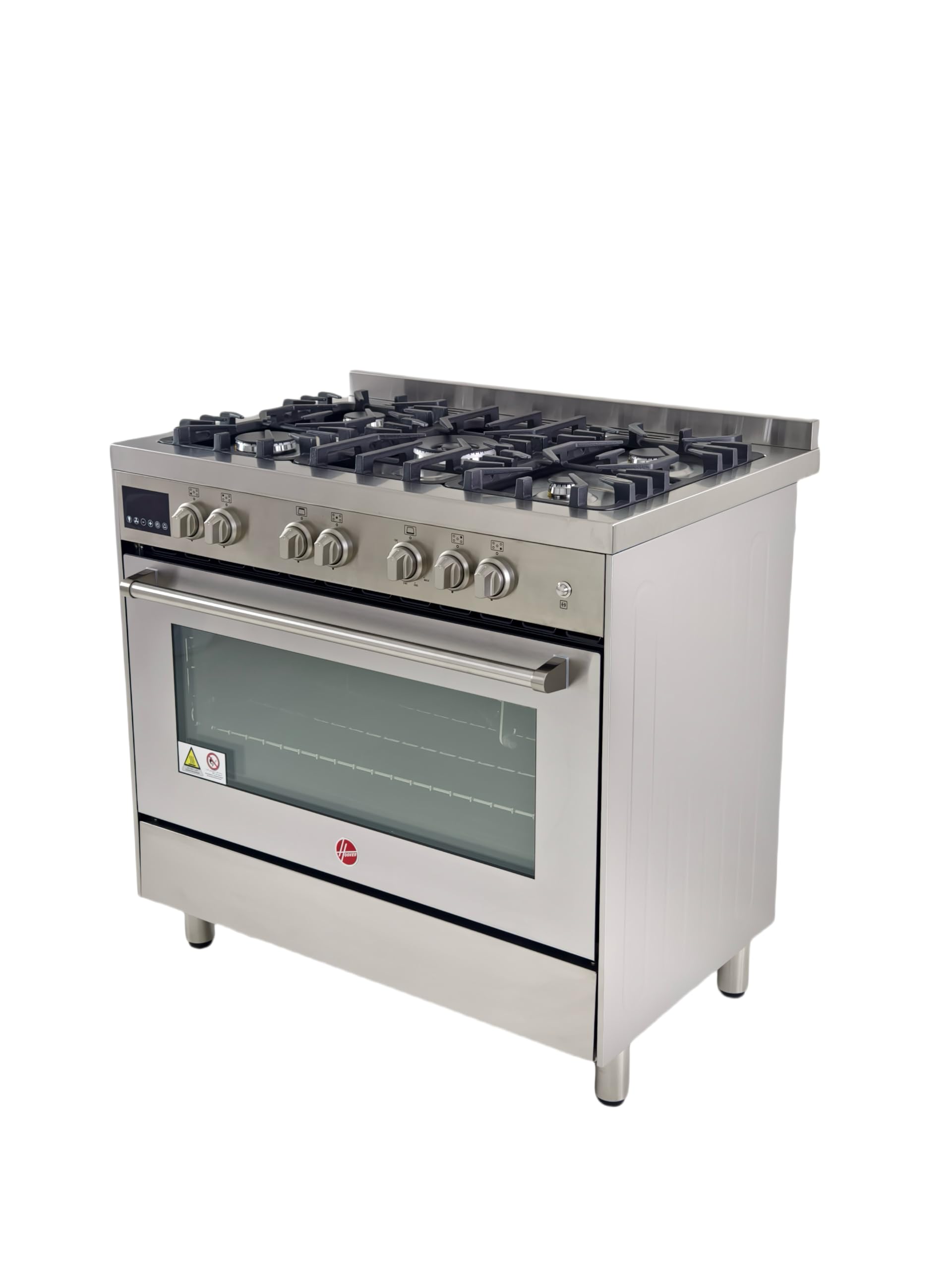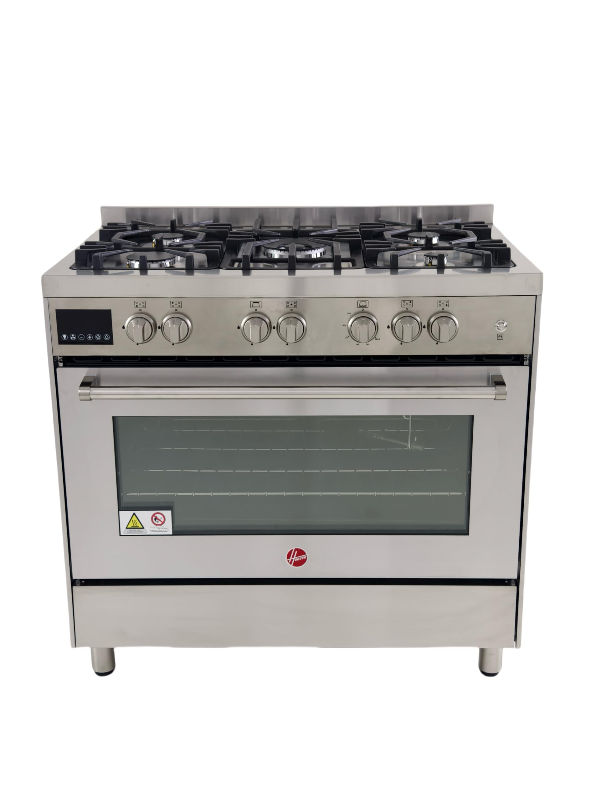 موقد غاز هوفر 90×60 بوصة بخمسة شعلات غاز (واحدة منها ووك)، مزود بميزات أمان كاملة، وفرن غاز وشواية، وإشعال تلقائي، ودعامة من الحديد الزهر، ومروحة تبريد وحمل حراري، وباب زجاجي ثلاثي الطبقات، مع ضمان لمدة عام واحد - SS -HGC-G95G-PS