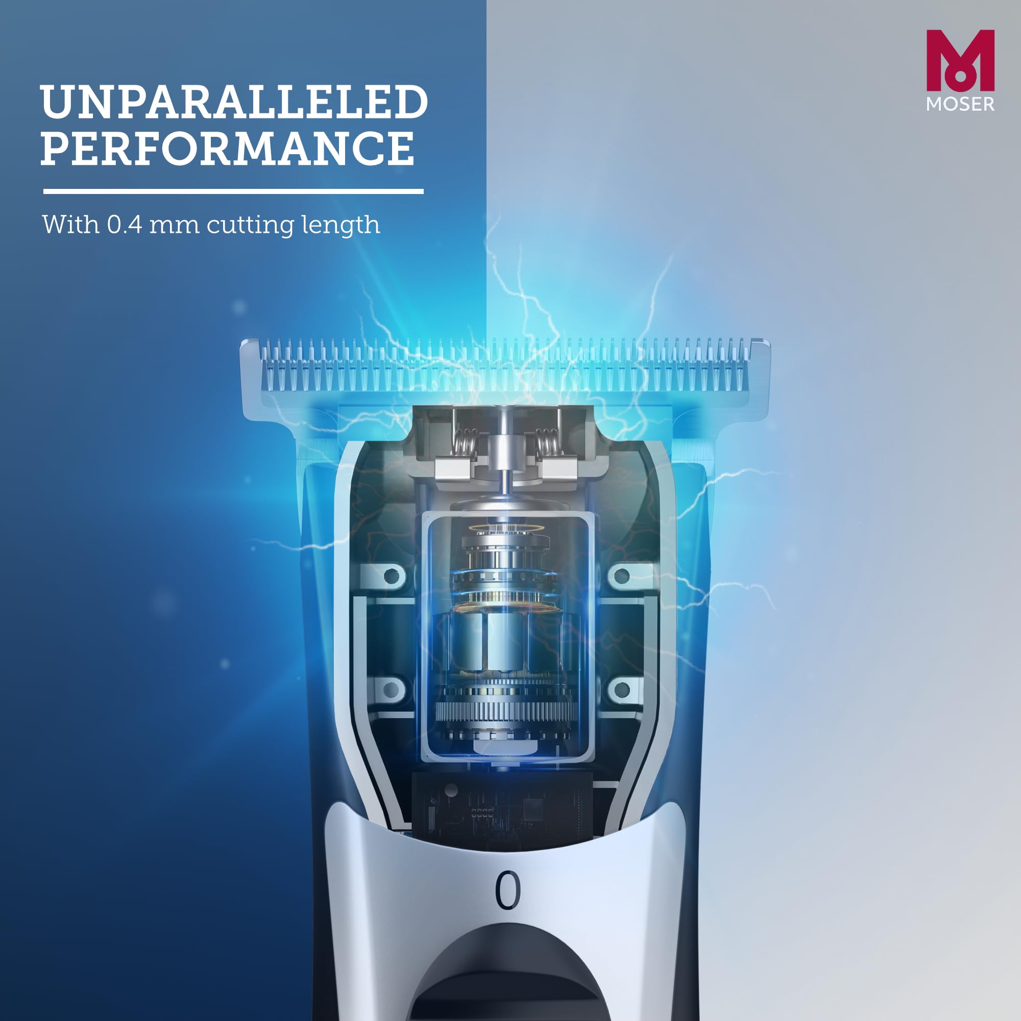 - قص دقيق باستخدام شفرة T: تتميز ماكينة Moser T-Cut بشفرة T مصنوعة من الفولاذ عالي الجودة مقاس 40 مم لقص دقيق يصل إلى 0.4 مم، وهي مثالية لتحديد محيط الرقبة واللحية وحول الأذنين.