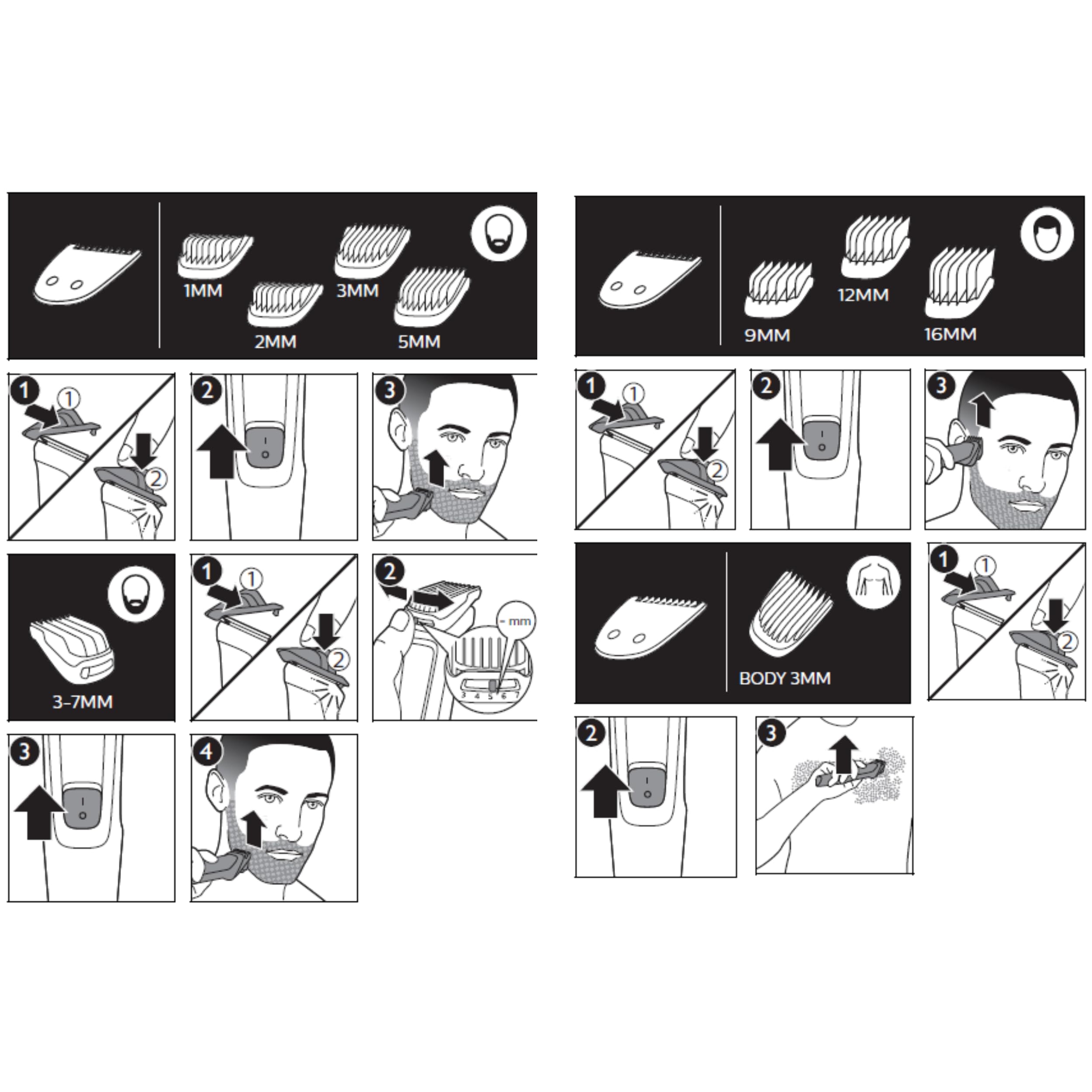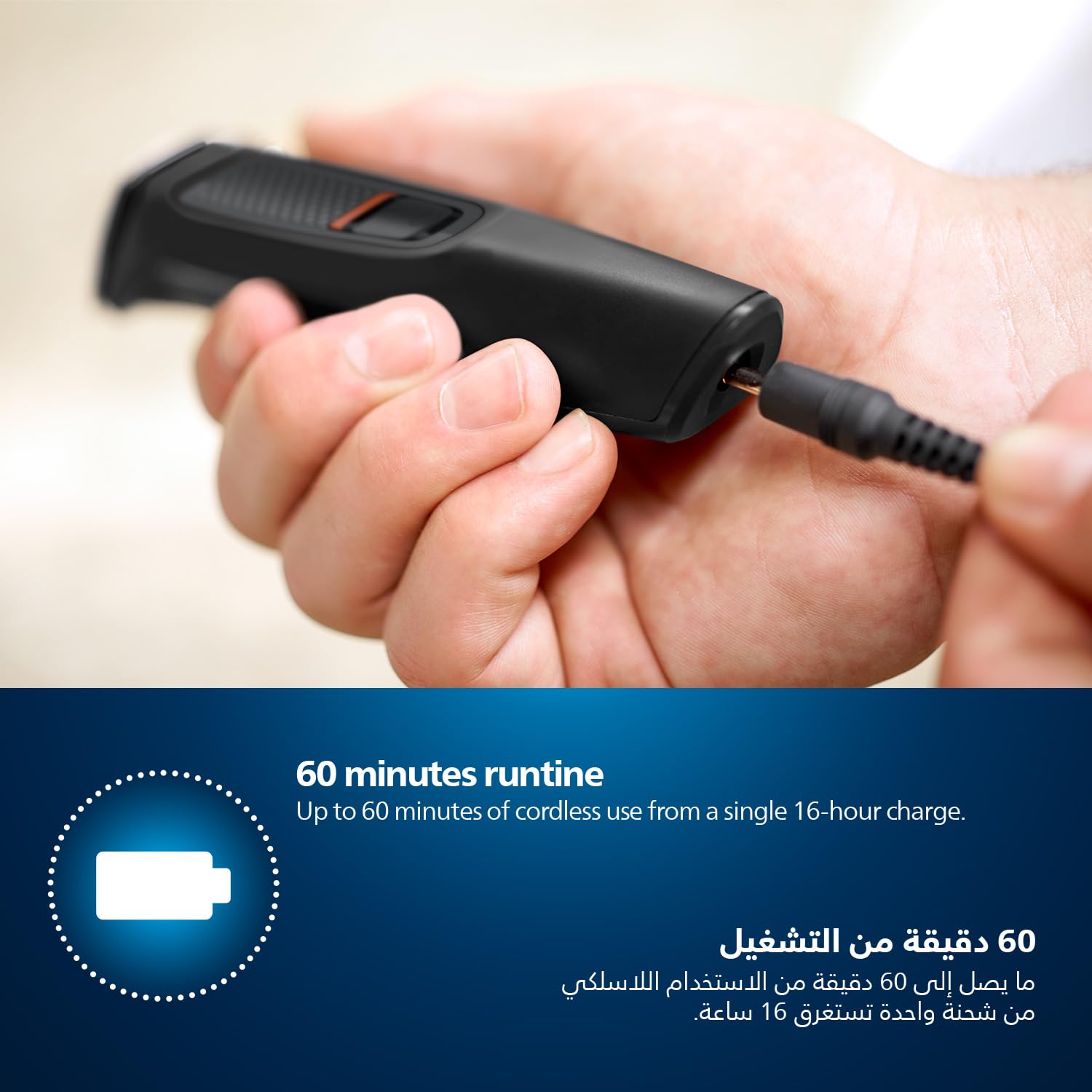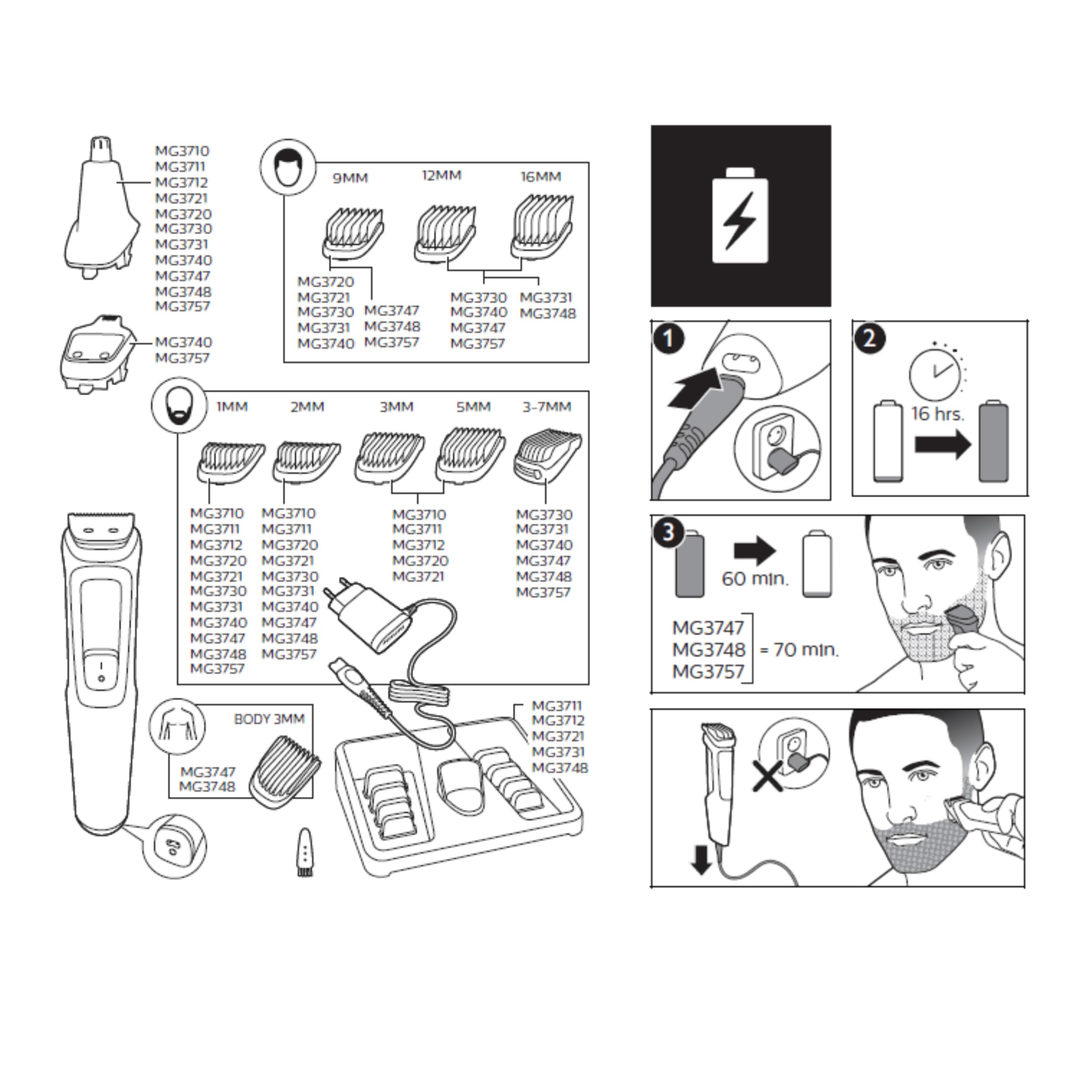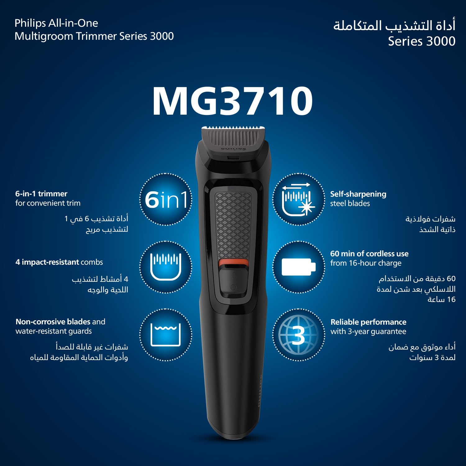 فيليبس مالتي جروم سيريز 3000 للوجه، مجموعة أدوات العناية 6 في 1 للحية والشارب والأنف والأذن، لاسلكية، وقت تشغيل 60 دقيقة، وقت شحن كامل 16 ساعة، MG3710/33، أسود