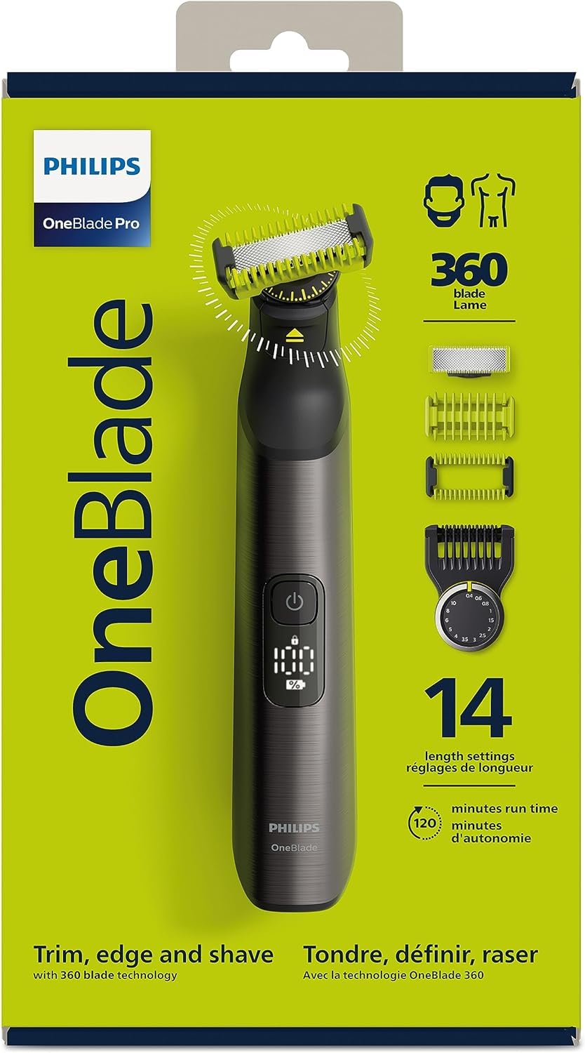 ماكينة OneBlade Pro 360 الجديدة للوجه والجسم تُشذب وتُحدِّد وتُحلِّق أي طول شعر، بسهولة أكبر*. انسَ الخطوات والأدوات المُتعدِّدة. OneBlade تُلبِّي جميع احتياجاتك. تتضمن شفرتين - واحدة للوجه وأخرى للجسم. تدوم الشفرة حتى 4 أشهر**. (*مقارنةً بالطراز السابق QP210. **لأفضل تجربة حلاقة. بناءً على حلاقتين كاملتين أسبوعيًا. قد تختلف النتائج الفعلية.)