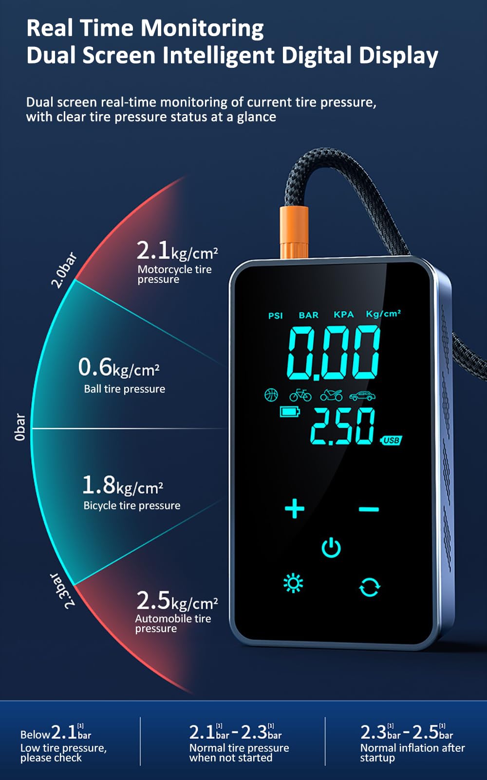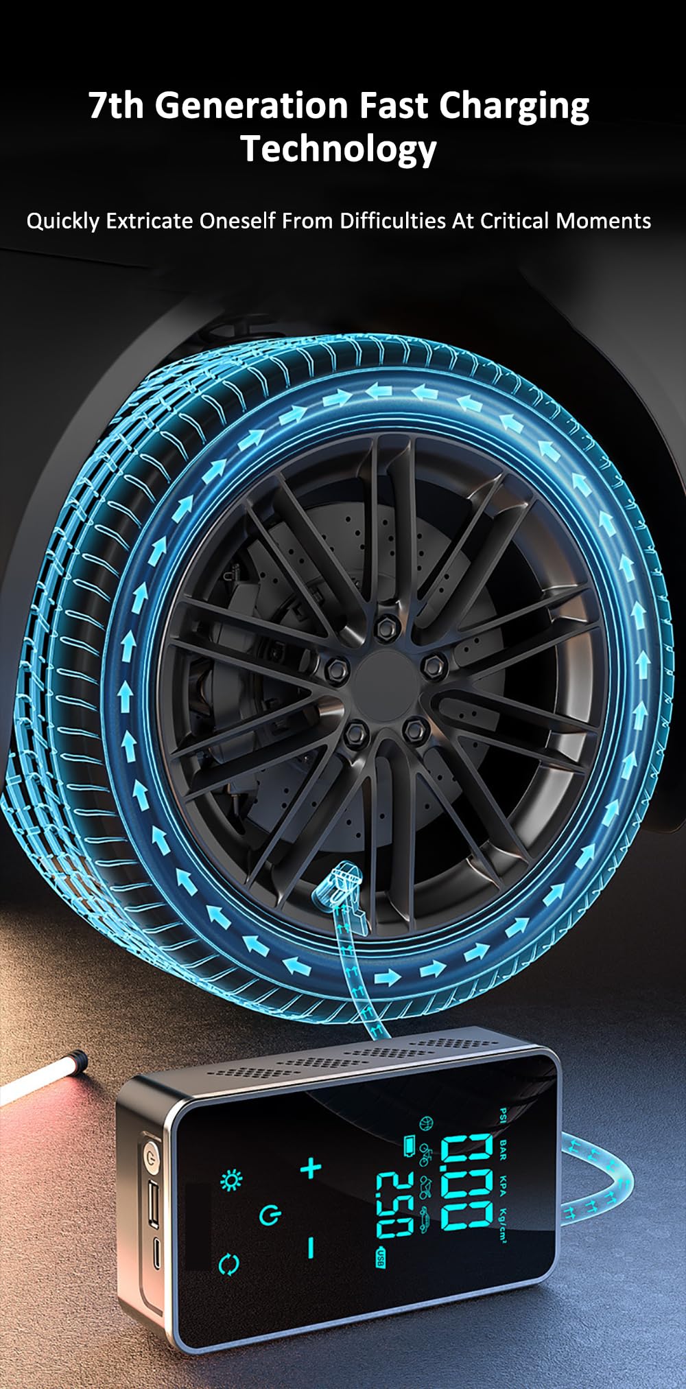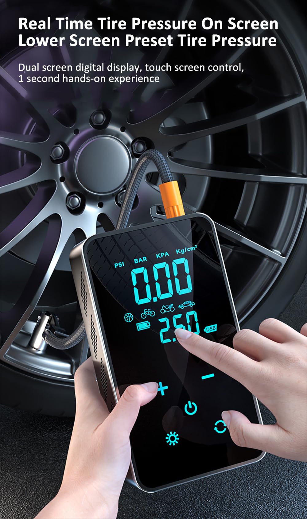 LED Display and Auto Shut-Off: This car tire inflator features a large LED digital display with 4 pressure units—psi, kPa, bar, and kg/cm². This air compressor will inflate the precise amount of air and automatically stop inflating when the tire pressure reaches the preset value, providing you with a safe, fast, and reliable experience.