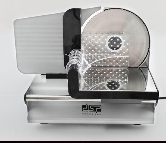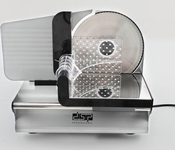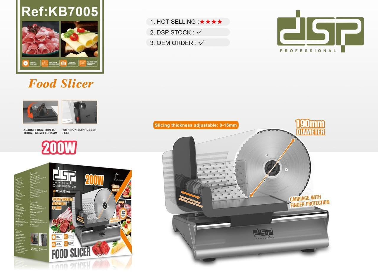 The DSP food slicer is a powerful and efficient tool with a 200W motor. This slicer is designed to make food preparation easy, whether you're slicing meat, cheese, or vegetables.