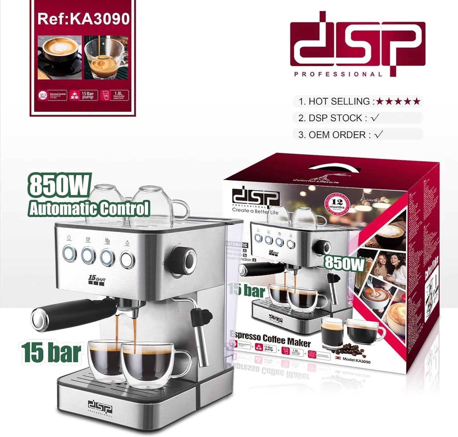 DSP Espresso 15 Bar Coffee Maker KA3090 | Capuccino | Milk Foam | Modern Kitchens | Steam Nozzle for Frothing Milk and Preparing Hot Drinks