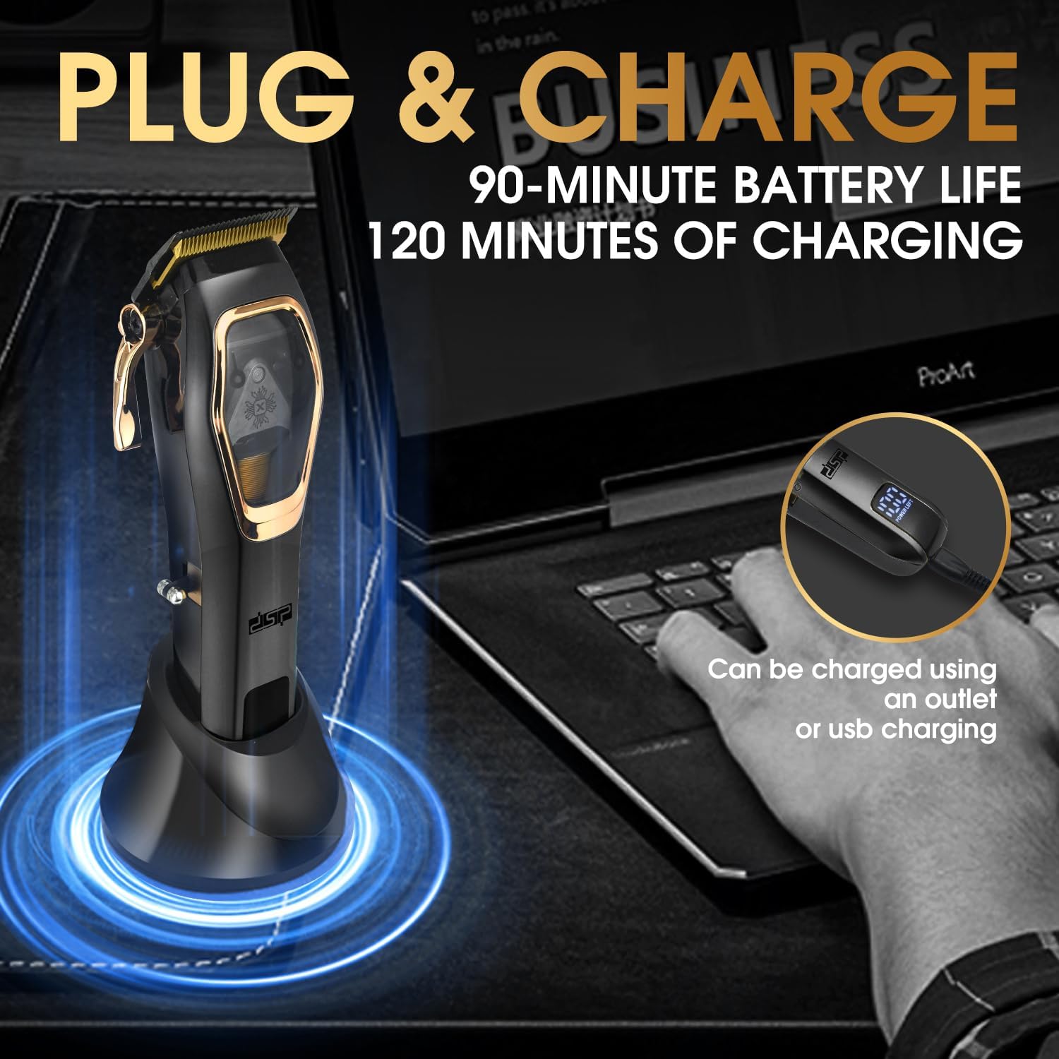 Product Specifications Voltage: DC 5V 1A Power: DC 5W Motor Type: High-efficiency Magnetic (Magnet Coil Winding) Static Blade: SUS420J2 Stainless Steel Moving Blade: Ceramic RPM: 9000 Charging Time: 210 minutes Discharge Time: 90 minutes Features: Constant speed control, digital display, not waterproof, not usable while charging. Key Features Unlock the secret to flawless grooming with the DSP Pro Barber Hair Clippers Set. Designed with precision for the professional barber, these clippers boast an array of features that set them apart from any other. Equipped with a revolutionary magnetic motor that operates at a stunning 9000 RPM, you'll experience constant speed control, ensuring smooth, uninterrupted cuts, and styles, regardless of battery life. The advanced ceramic blades offer unparalleled sharpness while minimizing heat and noise, ensuring your clients' comfort throughout their grooming session. Enjoy up to 90 minutes of runtime, making it perfect for back-to-back appointments without the need for constant recharging. The DSP Pro set is thoughtfully crafted to maintain its efficiency and speed, resisting the common pitfalls of traditional clippers such as pulling or snagging hair. This, along with its sleek cordless design, digital display for easy monitoring, and the fact it runs cooler and quieter, positions the DSP Pro Barber Clippers as the go-to tool for professionals aiming for precision fades, sharp line-ups, and detailed styling. Usage Scenarios Perfect for the busy barber shop or the professional stylist on the go, the DSP Pro Barber Hair Clippers Set guarantees satisfaction for both the user and client. Whether you're crafting intricate fades, executing precise shape-ups, or simply trimming and maintaining hairstyles, these clippers provide the ultimate flexibility and freedom to unleash your creativity without compromise. From the bustling environment of a professional barber shop to the personalized settings of a home studio, these clippers stand up to the demands of the day with exceptional performance and endurance. Enhance your grooming toolkit with the DSP Pro Barber Hair Clippers Set and experience the perfect blend of functionality, style, and comfort. Elevate your grooming game with DSP – where technology meets artistry.