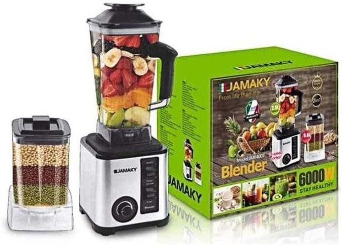 Brand: JAMAKY Model: JMK4007 Power: 600w Voltage: 220-240 V ~ 50/60 Hz. Capacity: 2.5 Liters Motor: 9525 motor Material: Stainless steel shell and blade With food pusher Stainless steel base Four-lobed stainless steel blade 15-speed control Ice crushing function Accessories: 0.8L Crushing Cup