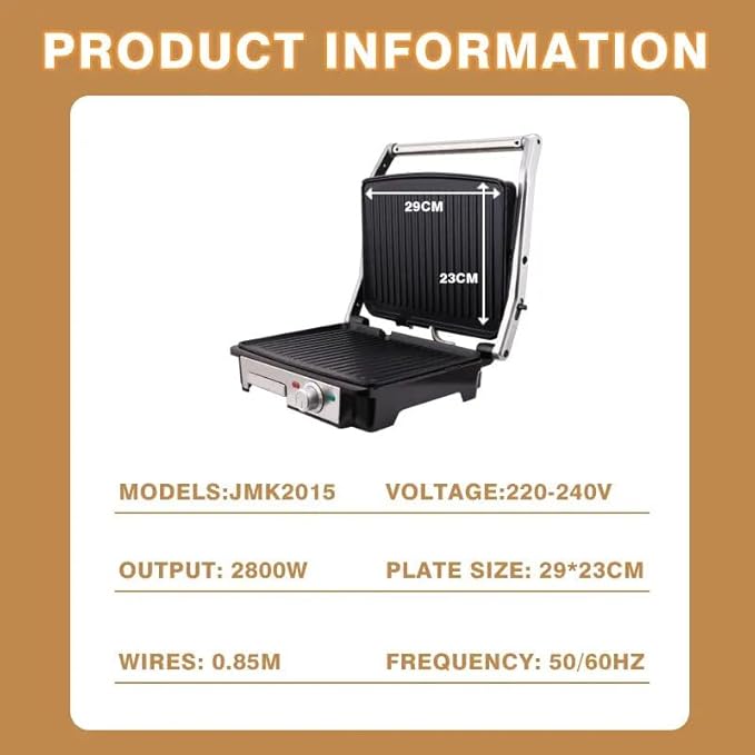 JAMAKY Professional Electric Grill - 2800 Watt, Silver - JMK2015 The JAMAKY Professional Electric Grill JMK2015 is a powerful and versatile kitchen appliance designed for grilling enthusiasts who enjoy fast, efficient, and healthy cooking. With a sleek silver finish, a 2800-watt output, and user-friendly features, this electric grill offers everything you need to cook your favorite meals to perfection. Key Features: Powerful Performance: Equipped with a robust 2800-watt heating element, this electric grill ensures rapid heating and efficient cooking, making it ideal for grilling a wide variety of foods. Non-Stick Coating Plate: The grill features a non-stick coating plate, which makes cooking and cleaning hassle-free. Food slides off easily without sticking, ensuring even cooking and easy maintenance. Adjustable Temperature Control: With an adjustable temperature feature, you can easily control the heat to suit different types of food, from vegetables to steaks, ensuring perfect results every time. Cool Touch Handle: The grill is designed with a cool touch handle for safe and easy handling during cooking, protecting you from burns while allowing you to manage your grilling comfortably. Drip Tray for Grease: The built-in drip tray collects excess grease and oil, promoting healthier grilling by reducing fat while keeping your kitchen clean. Dual Open Design (90 & 180 Degrees): The grill opens at 90 and 180 degrees, giving you the flexibility to use it as a contact grill or lay it flat for an expanded grilling surface, perfect for larger meals or parties. Electric Power Source: Powered by electricity, this grill is convenient and easy to use, with no need for gas or charcoal, making it a clean and eco-friendly cooking option. Design and Functionality: The JAMAKY Professional Electric Grill combines sleek silver aesthetics with high performance. Its non-stick plates ensure that food doesn’t stick while cooking, and its cool touch handle guarantees safe use. Whether you're grilling sandwiches, meat, or vegetables, the adjustable temperature control allows you to achieve the desired level of heat for perfect results. Additionally, the dual open design gives you the flexibility to use the grill as a panini press or open it flat to cook larger quantities at once, making it ideal for family meals or small gatherings. Healthier Grilling: The non-stick surface and drip tray work together to provide a healthier cooking experience by reducing the amount of oil and fat in your food. Excess grease is collected in the tray, allowing you to enjoy your favorite grilled dishes with less fat and fewer calories. Conclusion: The JAMAKY Professional Electric Grill JMK2015 offers an exceptional grilling experience with its powerful 2800-watt performance, versatile design, and easy-to-use features. Whether you're a seasoned grill master or just looking to prepare quick, healthy meals at home, this electric grill is a must-have for your kitchen.