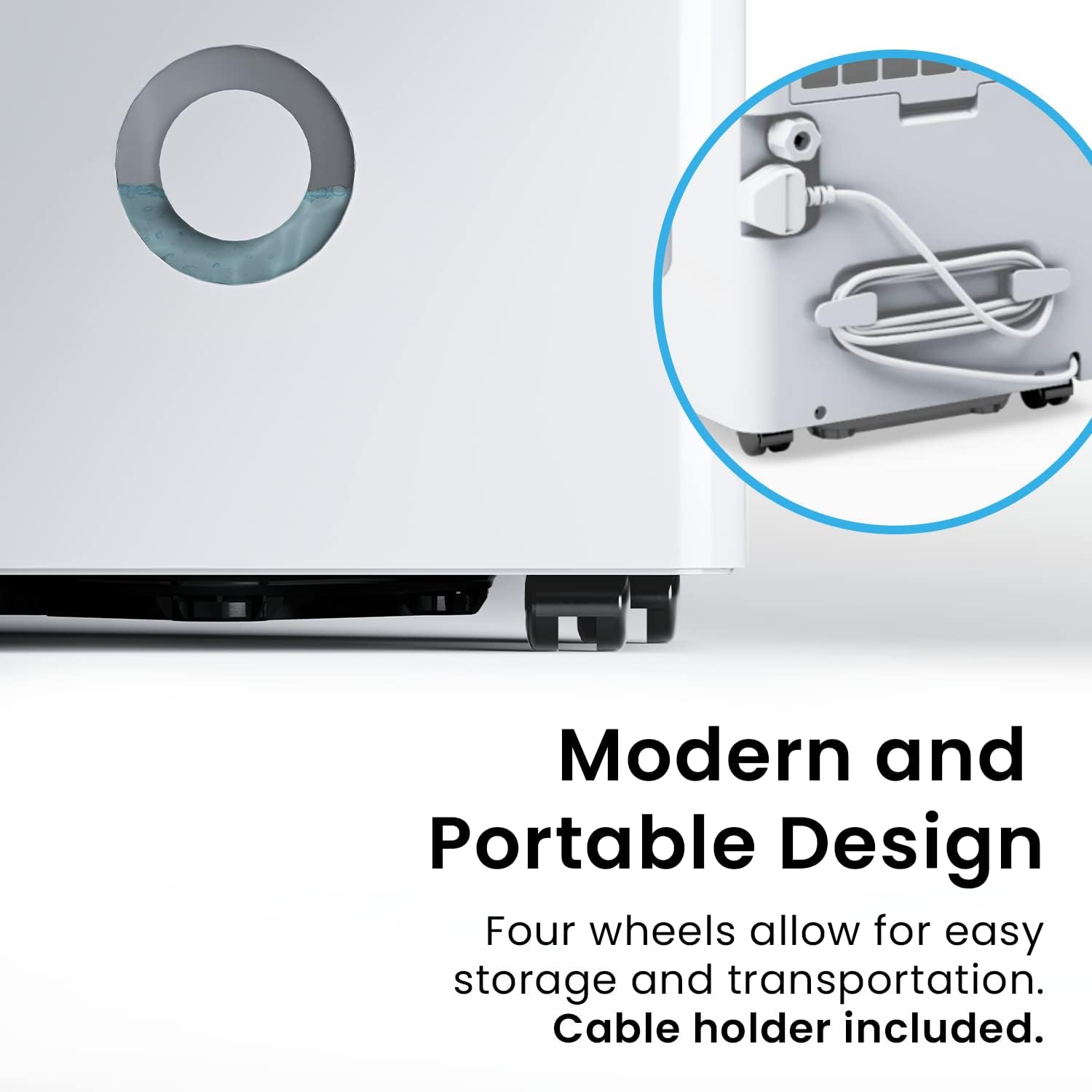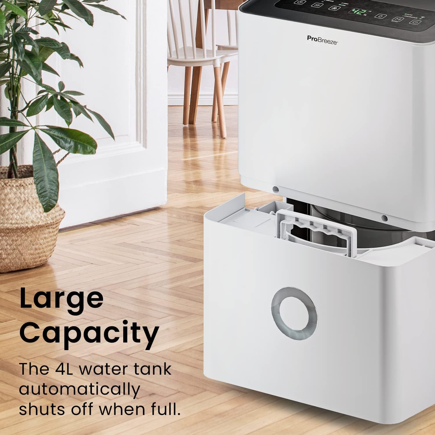 Remove moisture from the air while preventing window condensation and black mould in large spaces with the Pro Breeze High-Capacity Smart Dehumidifier. The powerful dehumidifier has a large 4L water tank and extracts up to 30 litres of water from the air per day. The free smartphone app lets you control the dehumidifier from anywhere, and settings include auto, continuous and internal drying. Fitted with a rear power cable holder and four wheels for easy transportation and storage.